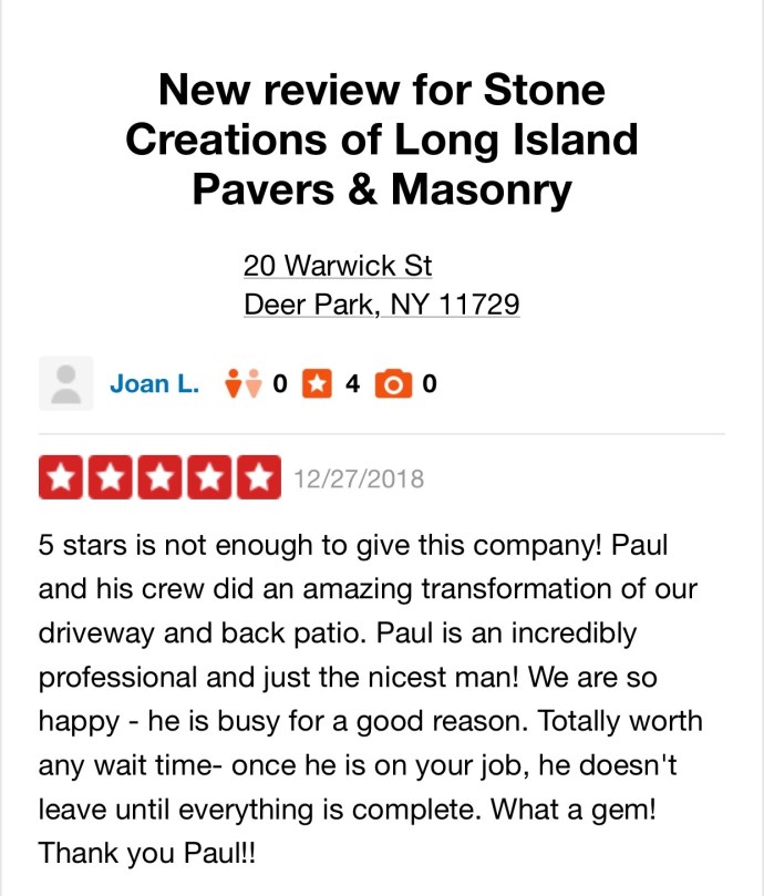 Stone Creations of Long Island Review – #thanks December 28, 2018 1242 × 1457 Top 5-Star Reviews for Stone Creations of Long Island – Deer Park, NY 11729 Yelp Review for Stone Creations of Long Island – Deer Park, NY 11729 Share with your friends: Share on Reddit (Opens in new window) Reddit Share on Nextdoor (Opens in new window) Nextdoor TweetShare on Tumblr Share on Threads (Opens in new window) Threads Like Loading...